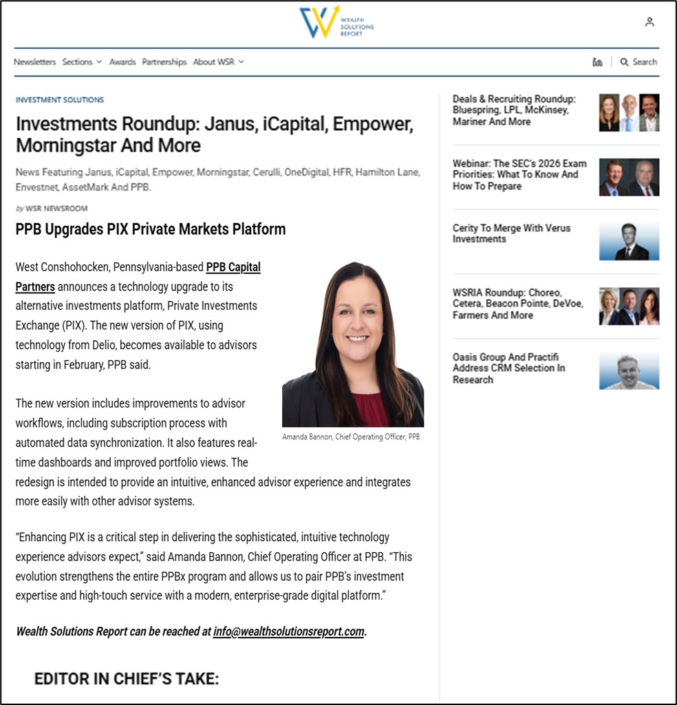 Wealth Solutions Report recently featured PPB Capital Partners, highlighting the firm’s latest technology upgrade to its alternative investments platform, Private Investments Exchange (PIX), designed to deliver a more intuitive, efficient experience for advisors.