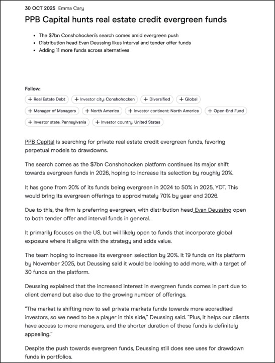 In an interview with With Intelligence, Evan Deussing outlined PPB Capital’s accelerating pivot toward evergreen private markets solutions, particularly in real estate credit. The $7bn Conshohocken-based platform has rapidly expanded its evergreen footprint—from 20% of its lineup in 2024 to 50% in 2025—and is targeting roughly 70% by the end of 2026. Deussing noted that the shift is driven both by client demand and the expanding universe of perpetual-life strategies, with PPB favoring interval and tender-offer structures for their shorter duration and improved access for accredited investors. While U.S.-focused managers remain the priority, PPB is open to strategies with selective global exposure where it adds value.