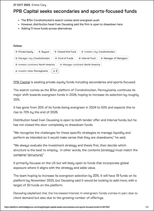 In an interview with With Intelligence, Evan Deussing outlines how the firm is setting its sights on secondaries and sports-focused private equity funds as part of a broader strategy to diversify its portfolio. The firm is prioritizing evergreen structures, while remaining open to drawdown and interval funds when the strategy calls for it, emphasizing the importance of aligning the investment approach with the appropriate fund structure.