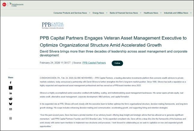 February 24, 2026, Conshohocken, PA – PPB Capital Partners, a leading alternative investment platform that connects wealth advisors to private markets solutions, today announced a partnership with David Silvera to further strengthen the firm’s long-term market position. Since 1990, Silvera has built a reputation as a highly respected and experienced asset management professional and serves as a PPB board member since 2022.
