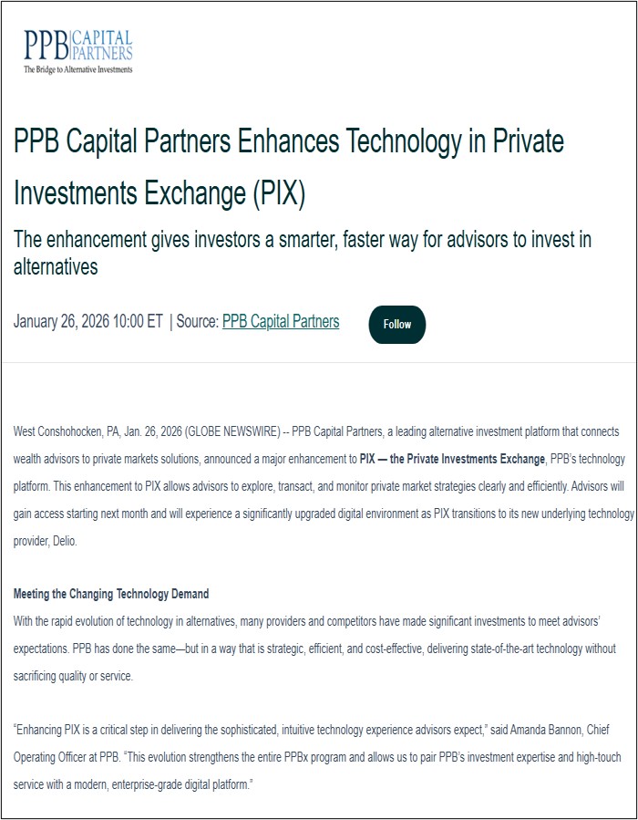 January 26, 2026, Conshohocken, PA – PPB Capital Partners, a leading alternative investment platform that connects wealth advisors to private markets solutions, announced a major enhancement to PIX — the Private Investments Exchange, PPB’s technology platform. This enhancement to PIX allows advisors to explore, transact, and monitor private market strategies clearly and efficiently. Advisors will gain access starting next month and will experience a significantly upgraded digital environment as PIX transitions to its new underlying technology provider, Delio.